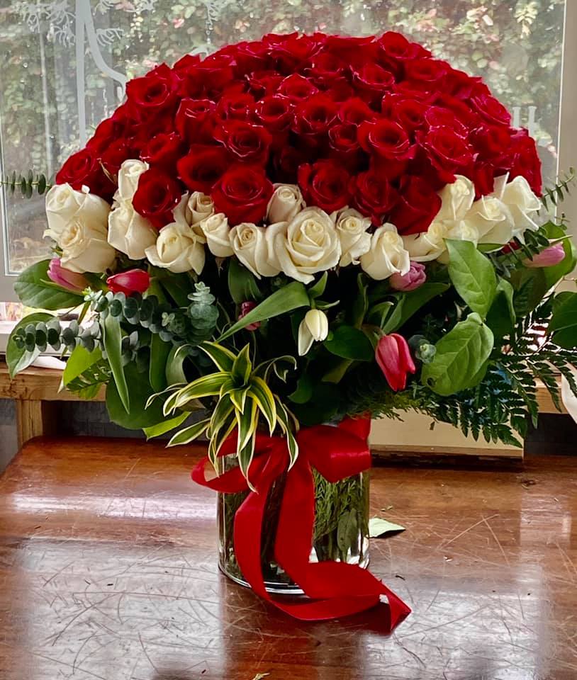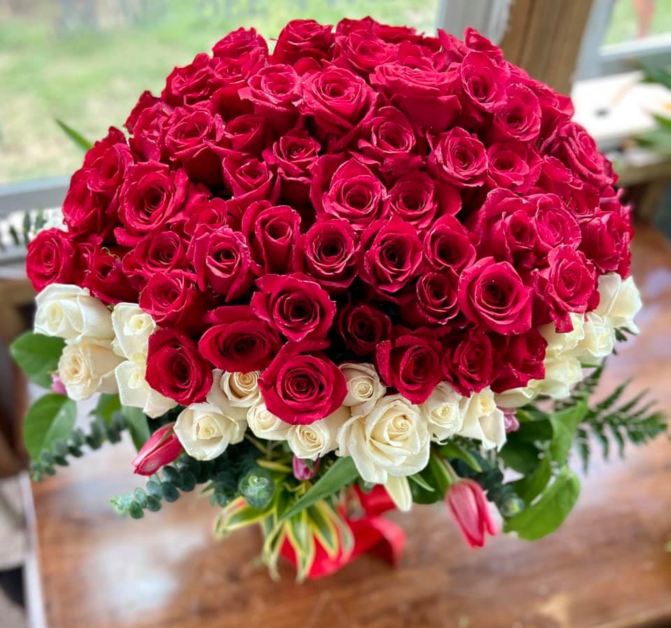 100 Red, 50 White, Dozen Tulips, Baby Blue and Lots of extras. Or All red.